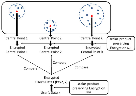 - Decision The cloud server takes the encrypted model and the encrypted data vector , the algorithm outputs a label for x, which means which central point x is clustered into.