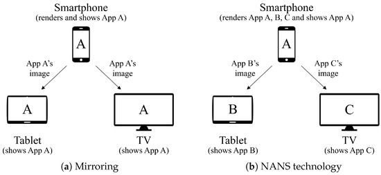Thanks to the advance of recent display interface technologies such as wireless Miracast [1] or wired HDMI (High Definition Multimedia Interface) [2], users can connect their smartphones to external large display devices such as TVs and PC monitors. Through these display interfaces, Mirroring, i.e., a typical multi-screening technique, mirrors the current screen of the smartphone onto all the connected external display devices as shown in Figure 1a. Mirroring cannot meet the user’s needs for using the smartphone display and external displays for displaying multiple different applications. For example, it is not possible to show a mobile messenger on the smartphone display, a movie player on the TV display, and a web browser on the tablet display simultaneously.