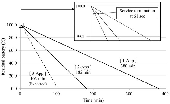 Figure 2 shows how the residual battery level decreases for the 1-App, 2-App, and 3-App scenarios of NANS services. As expected, the 2-App scenario uses more battery power than the 1-App scenario and hence the battery is exhausted much earlier at 182 min (≪380 min). Although the 3-App scenario uses more battery power than the 2-App scenario, the 3-App scenario is terminated long before the battery runs out. For the 3-App scenario, the expected battery life is 103 min as shown in the dashed line in Figure 2. Nevertheless, the NANS service is terminated at 61 s as shown in the magnified view box in the figure.
