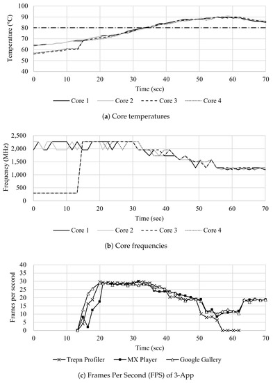 The reason for this service termination is CPU throttling, i.e., CPU frequency reduction to prevent thermal violations. Figure 3a shows the cores’ temperature increase for the 3-App scenario. Whenever the temperature reaches the predefined level, e.g., C as in Figure 3a, the CPU throttling considers the temperature increase to be abnormal and simply lowers the CPU’s frequency starting from 33 s as shown in Figure 3b. As a consequence, the execution of the three applications slow-down—the FPS (Frames Per Second) drops as in Figure 3c, and eventually the ANR (Application Not Responding) timer expires at 61 s and the service of Trepn Profiler is terminated.