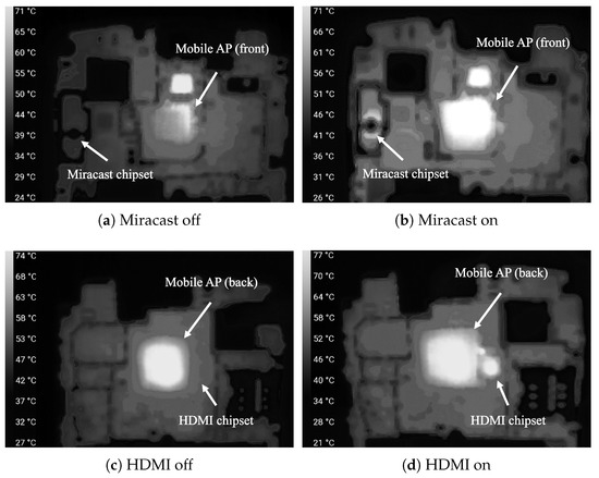 Comparison of surface temperatures of mobile AP (Application Processor), Miracast chipset, and HDMI (High Definition Multimedia Interface) chipset with and without Miracast and HDMI on smartphone.