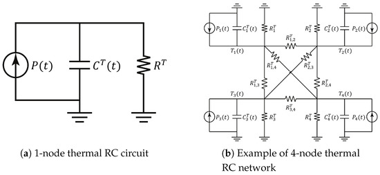 This 1-node thermal RC circuit is extended to an n-node thermal RC network by several studies [6,7,26] to model the thermal behaviors of multiple CPU cores, LCD, WiFi chipset, and other hardware components in a smartphone device. Figure 6b shows an example of a 4-node thermal RC network where four 1-node thermal RC circuits are completely interconnected by inter-node thermal resistances, which models thermal interactions among hardware components through their interconnecting materials. For such an n-node thermal RC network, the thermal differential equation in Equation (1) is extended in a form of a temperature vector and a power-flow vector as follows: