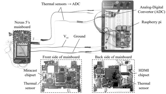 To overcome the first issue, as shown in Figure 7, we attach tiny thermal sensors on top of the Miracast chipset and HDMI chipset, and connect them to Raspberry Pi through an analog-digital converter (ADC). To minimize the error caused by the ADC, we decouple the power supplied to each temperature sensor as in [45]. To reduce the effects of noise, we also use the average value of the temperatures collected for 1 s. Using such made data acquisition system, we now can measure and .