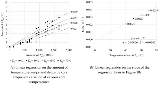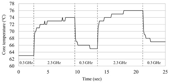 Although we cannot make exactly for minimal system operation on core , we can minimize the operating parameters’ effect by keeping . Based on this approximation, in order to collect a large data set for Equation (12), we first heat all the hardware components to 114 °C by operating them at the maximum operating parameters. Then, we cool them down by keeping . In this cooling-down phase, we read the temperature sensors on the CPU cores and display chipsets at every forming the following 300 equations: