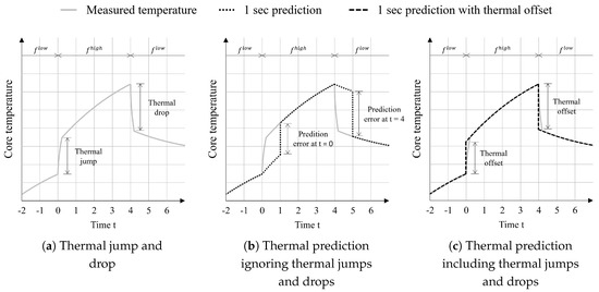 These thermal jumps and drops have been overlooked in previous researches, since the prediction error due to the thermal jumps and drops last only one time step, , until the core temperature sensor is read again. Figure 9a shows an example plot of the core temperature including a thermal jump and drop. Figure 9b shows the predicted core temperature with a time step size of s. In this figure, the core frequency increases at time and hence the core temperature jumps within a very short time. A prediction made at time , ignoring such a thermal jump, underestimates the core temperature until the next step when the temperature sensor is actually read at time . After that, the predicted temperature is relatively accurate until time . At time when the core frequency decreases, the core temperature suddenly drops, but the prediction at time ignores the thermal drop and therefore overestimates the temperature value until the next step, , where the temperature sensor is read again.