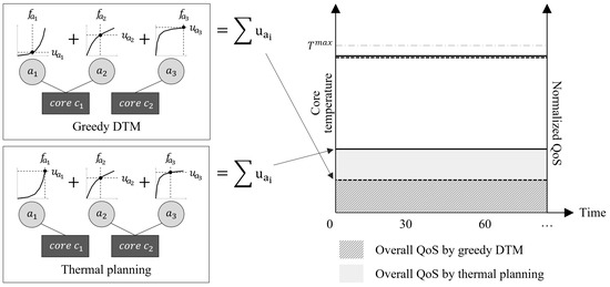 In proactive DTM, decision making is based on future temperatures predicted by a thermal prediction method. Each study in [6,8,13,15,25,26] considered different heat sources, but all studies use thermal prediction methods in their proactive DTM. Das et al. [27,28] reported that their proactive run-time manager using reinforcement learning reduces thermal overheads, such as average temperature, peak temperature, and thermal cycling. The authors of [9,11] proposed DTM techniques using the power budget given by thermal prediction. Since the focus of these studies is on protecting the system from thermal threats such as thermal violation or thermal variance, they do not consider QoS at all.