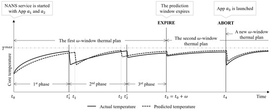 In some studies employing DTM techniques, instead of adjusting the operating frequency to handle the CPU temperature, some employed a task migration strategy to lower the hottest core’s temperature. Sharifi et al., in a series of studies [10,33,34] assigned workloads to heterogeneous multi-core CPUs and controlled the core frequency according to the workload’s performance requirement in their proactive DTM. Kim et al. [35] used task migration in order to keep temperatures of different types of processors below the thermal threshold. Alsafrjalani et al. [36] reduced the temperature of heterogeneous multiprocessors while meeting performance and energy constraints without a priori knowledge of applications. The ideas of these studies are not appropriate for NANS service scenarios because all cores are likely to be fully used and hence have similarly high temperatures.