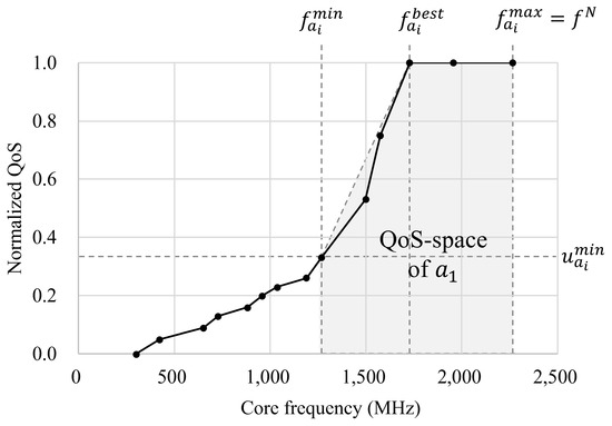 To characterize the QoS function for each application, we use different QoS metrics for each category, i.e., the execution time for execution-oriented applications, the average FPS for FPS-sensitive applications, and the response time from the user input time for response-sensitive applications. For each application, we measure its QoS metric while changing the CPU core frequency from the lowest to the highest setting. The measured QoS is normalized to the best possible QoS achievable at the highest core frequency. According to the quantifying method in [49], we find the lowest core frequency that does not cause ANR (Application Not Responding) interruption by the system and mark it as the minimum frequency. All the details of such normalized QoS functions for the 9 applications can be found in [50]. We also assume weights of 3.0 for an FPS-sensitive application, 2.0 for a response-sensitive application, and 1.0 for an execution-oriented application.