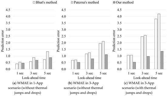 Figure 18 shows the comparison results of the thermal prediction error in terms of . Figure 18a is for the 1-App scenario where only one application, i.e., Trepn Profiler (a hardware usage monitor), runs on the smartphone for 10 min while keeping CPU core frequencies at the maximum level to avoid the effects of thermal jumps and drops. During a 10 min experimental interval, every 1 s, we predict the temperatures for 1 s, 3 s, and 5 s look-ahead times as well as measure the actual temperatures at those times. Their absolute gaps between predicted and measured temperatures are averaged with weights as shown in Equation (41). In this 1-App scenario, only CPU cores are the major heat sources, not display chipsets. Thus, Bhat’s method shows the best accuracy for all of the 1 s, 3 s, and 5 s look-ahead predictions. It is because Bhat’s method accurately models the CPU cores’ thermal behaviors with CTM. On the other hand, Paterna’s method shows much larger prediction errors and the errors increase more sharply as the look-ahead interval is increased from 1 s to 5 s. This is because of the inaccuracy of the simplified thermal model of Paterna’s method. Our proposed method is also based on the accurate CTM model and hence its accuracy is comparable with Bhat’s method. A little bit larger prediction errors are experienced for our method because our method uses only observable operating parameters, not hard-to-get CTM parameters. This is necessary when considering NANS services where display chipsets become major heat sources.
