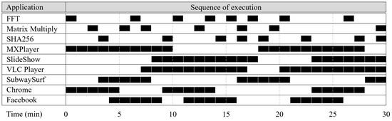 To reflect realistic use cases of our NANS services, we generate a test execution sequence using the above 9 applications. For the three categories, we set the running time of applications to 1 min, 5 min, and 10 min, respectively. Alsafrjalani et al. [51] modeled the arrival time for each application using the normal distribution. According to this model, we select the applications to be newly launched every minute. The number of concurrent applications is limited to 3 to 5. The generated 30 min scenario as shown in Figure 19 covers various NANS service scenarios from 3-App scenarios to 5-App scenarios of various combinations of different category applications.