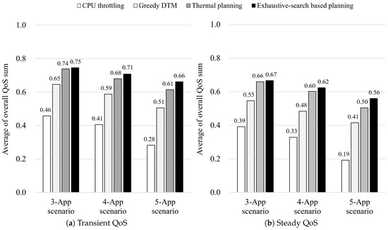 Figure 21a shows the averages of the overall QoS sum of transient duration for 3-App, 4-App, and 5-App scenarios. For all scenarios, the average of the overall QoS sum, i.e., y-axis in the figure, is normalized to the average of the ideal QoS sum, which ideally assumes the best QoS for all the running applications for all the times without being aware of the CPU cores’ performance limitation and thermal limitation. For the 3-App scenarios, the transient QoS gain of our proposed thermal planning over greedy DTM is 14% (0.74 vs. 0.65) on average. This transient QoS gain becomes more significant for 4-App and 5-App scenarios and as a result the transient QoS gain for 5-App scenarios is 19% (0.61 vs. 0.51) on average. This implies that careful use of the thermal budget becomes more important for executing more applications at the same time.