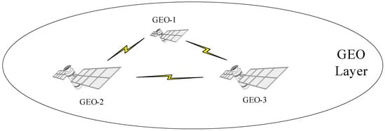 (GEO Layer Satellite System). GEO is a special geosynchronous orbit with zero inclination with an orbital height of 35786 km and the same orbital period as the Earth’s rotation cycle. The satellite covering area of the orbit is large and static relative to the ground, so it is playing increasingly important roles in the civil and military fields, such as communication, navigation, warning, and meteorology. Therefore, in the SIN, we can rely on at least three GEO satellites to achieve the construction of the GEO layer satellite system, and the system can achieve 360° full-cycle coverage. The composition structure of the GEO layer satellite system is shown in Figure 1.