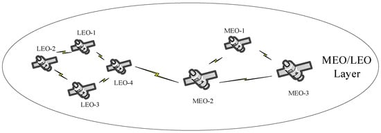 (MEO/LEO Layer Satellite System). The MEO satellite orbital is 5000~20,000 km and the LEO satellite orbital is generally between 700 km and 1500 km. The satellites serving the MEO/LEO layer exist in the network form, and in the SIN, the MEO/LEO double-layer constellation network mode is adopted. Among them, the MEO satellites are mainly used as routing exchange stars and access stars. The LEO satellites are mainly used as access stars, and they can access the application stars and ground stations. The composition structure of the MEO/LEO layer satellite system is shown in Figure 2.