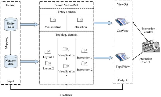 - View set: The view set is the output module of the SINDVis, including the entity domain view, named GeoView, and the topology domain view, named TopolView. As we know, the visual view is a direct embodiment of the implementation of visualization technologies, and it is also a medium for showing information and implementing user interactions. Meanwhile, we think of the visual method set as processing, and the view set as results. Therefore, we constructed the visual method set and the view set separately. In SINDVis, the GeoView and TopolView appear on different pages at the same time. Of course, the specific display forms of the GeoView and TopolView depend on the specific visual methods selected. Meanwhile, the view set can feed the user’s new requirements into the input module and the core-processing module, thus generating output modules that meet users’ new requirements.