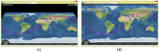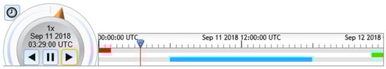 As a scripting language, Cesium was created for a cross-platform virtual globe display by AGI (Analytical Graphics, Inc., Exton, PA, USA) in 2011. Initially, people primarily used Cesium for dynamic data visualization in space and defense industries. Later, Cesium gradually developed into a 3D map and is used in multi-fields, including geographical space, oil, gas, agriculture, entertainment, and sports []. According to data from Cesium’s homepage, over 140 cases have been successfully implemented based on Cesium.js. They cover space, defense, smart cities, geo-space, sports, entertainment, and so on. Combined with the functions of GeoView and the successful application of Cesium in other fields, the implementation of GeoView based on Cesium.js is feasible. Therefore, we implemented the GeoView based on Cesium.js in this study. The specific technologies are not discussed much in this section. However, because the GeoView is dynamic, the Cesium time panel was used to achieve time control, as shown in Figure 6.