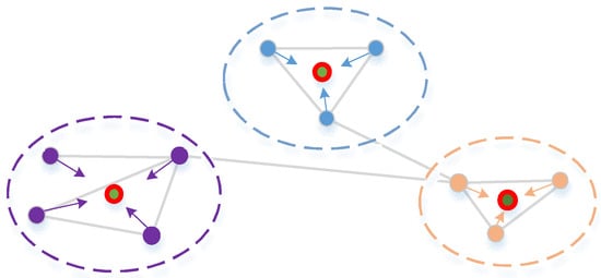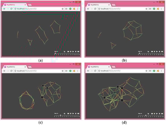 Therefore, under the guidance of the topology evolution rules and the FR algorithm, we introduced clustering coefficients to calculate the importance of nodes and took node addition, node deletion, link addition, and link deletion into account to realize the effective layout of the dynamic visualization of SIN. The basic principle of the FR algorithm is the simulation of the motion of atoms and celestial bodies by analyzing the attraction and repulsion between the vertices and edges of the network. This method considers that there is attraction between the vertices and edges and that the vertices are mutually exclusive []. In the concrete implementation, spatial coordinate changes between the nodes are calculated by simulating the forces of the atom balls, and then the temperature variable and the cooling function are introduced, and the positions of all vertices are calculated by multiple iterations using the simulated annealing algorithm. The three steps taken to complete each iteration are as follows: