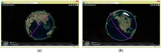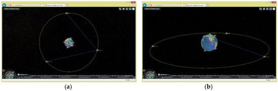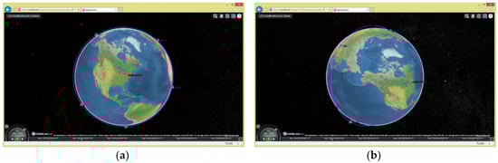 As described in Section 3.2.1, we used the LEO satellite system as an example to determine the whole function of the system. It was assumed that the LEO satellite system consists of five LEO satellites and one ground station. The GeoView not only supports a 3D view display, but also supports 2.5D and 2D view modes, and users can switch between pages.