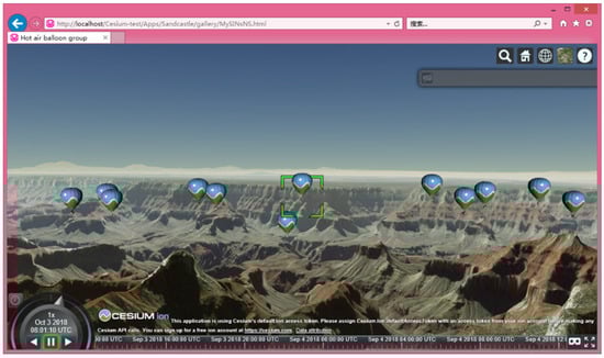 As shown in Figure 15, by loading the balloon model in the Cesium library, a balloon swarm is constructed with 12 balloons. We selected the balloon surrounded in the green box as a data transmission center that can connect with the ground station and 11 other balloons.