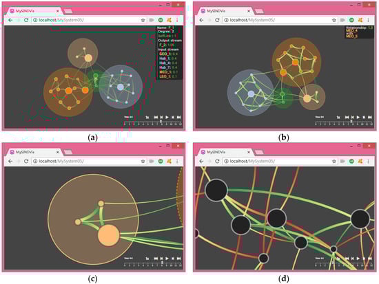 In Figure 17, Figure 17a shows the interactions between the user and the node. When the user puts the mouse over a node, the details of the node appear at the top right of the page, including the node name, node degree, output stream, and input stream. The detailed information is hidden when the mouse is moved. Figure 17b shows the interactions between the user and the edge. When the user puts the mouse over a connecting edge, information about the edge of the details, including the target node and the source node’s name and the connection level appear in the upper right of the page. The detailed information is hidden when the mouse is moved. Figure 17c shows a translation of the interactive function. To display only the details of the GEO layer on the page, the other parts of the network can be translated out of the visual page. Figure 17d shows a zoom function based on Figure 16d, that is, it displays details on the same size page by scrolling the mouse to zoom in the page.