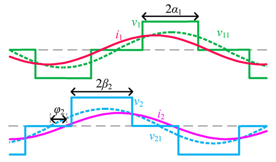 The schematic of a WPT system with one active receiver is depicted in Figure 2. V1,dc, V2,dc, I1,dc and I2,dc are the primary and secondary dc voltages and currents, respectively. C1,dc and C2,dc are the filtering capacitors and RL,2 is the load. L1 and L2 are the transmitting and receiving coils compensated by C1 and C2, respectively. R1 and R2 are the coil resistances. Q1–Q8 are eight metal-oxide-semiconductor field effect transistors (MOSFETs). v1 and v2 are the voltages applied on the resonant network, which contain only the odd frequency components. i1 and i2 are the primary and secondary resonant currents. Their fundamental frequency components are denoted as v11, v21, i11 and i21, whose root-mean-square (RMS) values are V11, V21, I11 and I21, respectively. Due to the band pass filtering effect by the resonant network, the fundamental frequency component contributes most to the transferred power. Therefore, i11 and i21 are nearly the same as i1 and i2, respectively. The typical waveforms of the system are presented in Figure 3, where v21 leads i21 by φ2. 2α1 and 2β2 represent the phase angles of the resonant voltages. In most of the previously published papers related to WPT systems, fundamental harmonic analysis (FHA) and phasor methods are widely adopted [20,21,22], which can greatly simplify the analysis. In this paper, boldface letters represent the phasors and capital italic letters represent RMS values of the phasors. For example, V11 and V11 represent the voltage phasor and RMS value of v11, respectively.