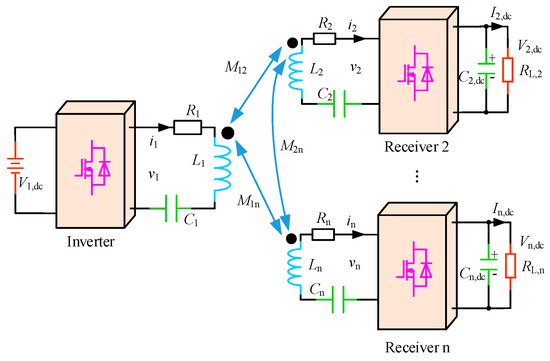 Figure 5 shows a multiple active receiver WPT system without cross coupling among the receiving coils, which has one transmitter and multiple receivers. The transmitting and receiving coils are coupled, whose mutual inductances are denoted as M1i (i ≥ 2). Li, Ri, Ci, Ci,dc and RL,i are the coil inductance, coil resistance, compensation capacitor, filtering capacitor and loading resistance of receiver i, respectively. vi, ii and Ii,dc are the resonant voltage, resonant current and output dc current, respectively.