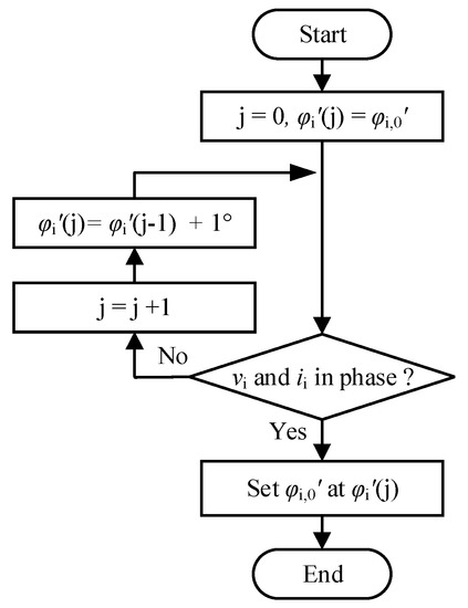 vci lags ii by 90°. However, due to the time delay of the frequency locking and the driver circuits, φi,0 in Equation (37) is uncertain and can differ from the coded initial phase. After locking the frequency, the reference phases of the controllers should be calibrated, which is implemented by software code. The coded phase defined in the controller is φi’ whose initial value is φi,0.’ The task of reference phase calibration is to change φi,0’ to ensure φi,0 = 0, that is, vi and ii are in phase. Figure 8 shows the reference phase calibration process. Firstly, φi’ is set at φi,0.’ vi and ii are captured by the oscilloscope. Then, the system is turned on and vi and ii phase synchronization is observed. If vi and ii are not in phase, traversal algorithm can be executed to change φi,’ where φi’ can vary from φi,0’ to 360° + φi,0.’ Once vi and ii are in phase, the reference phase is locked and φi,0’ is determined. Since the time delay remains almost unchanged for a certain circuit, the corresponding phase error is independent of the load, the mutual inductance and other system parameters. Furthermore, the reference phase calibration only needs one execution after the system is implemented and it can be completed within several minutes, which makes this synchronization technique easy for wide applications.