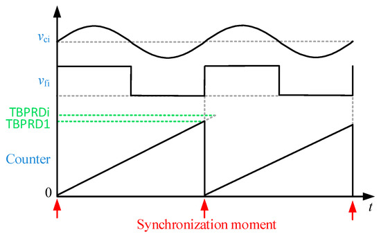 There are three counter modes of the enhanced pulse width modulator (EPWM): count-up mode, count-down mode and count-up-down mode. For easy calculation of the register values, the count-up mode is adopted in this work. The frequency locking process in the controller is shown in Figure 9, where TBPRD1 and TBPRDi (i ≥ 2) are the time base periods (TBPRD) of the PWM modules of the transmitter-side and receiver-side controllers, respectively. For better understanding, the time delay of the devices is not considered in this analysis. Ideally, time base periods can be the same. However, the actual output frequency will deviate from the preset value due to limited frequency precision. In practice, TBPRDi should be greater than TBPRD1. The receiver-side controller detects the frequency locking signal at first, where the counter should be equivalent to TBPRD1. Then, the counter is reset to 0. This process can ensure the frequency of vi equal to f1.