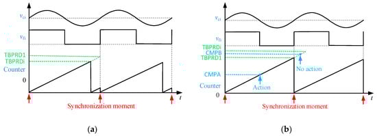 Faulty configurations of the reserved registers can lead to two problems. Firstly, as shown in Figure 10a, where TBPRDi is smaller than TBPRD1, the counter operates abnormally. The counter reaches TBPRDi and is reset to 0. When the frequency locking signal appears, the counter is reset to 0 again, resulting in a wrong counting sequence. Therefore, TBPRDi should be greater than TBPRD1. Secondly, as shown in Figure 10b, although the counter operates normally, an erroneous gate drive signal is generated. Comparing values of groups A and B (CMPA and CMPB) are used to generate βi and φi. When CMPB (or CMPA) falls into the range of (TBPRD1, TBPRDi), wrong gate drive signals appear. The counter cannot reach the reserved register value where the control signal is supposed to be toggled. Then, the gate drive signal remains unchanged, which leads to a wrong vi. Therefore, the maximum CMPA and CMPB should be slightly smaller than TBPRD1, which is denoted as CMPmax. The specific value of CMPmax should be determined according to the frequency precision of the controllers.
