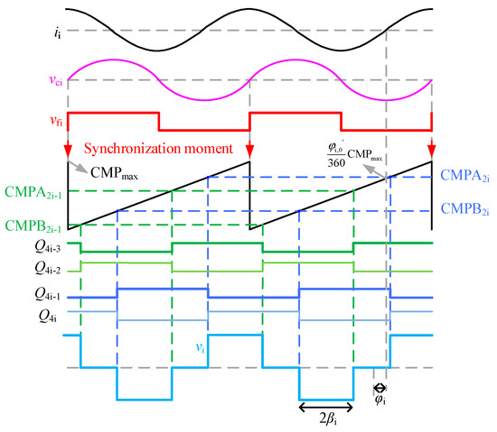 Figure 11 shows the detailed synchronization process and corresponding relationships among the reserved register values and the phase angles. The gate drive signals of receiver i are denoted as Q4i−3, Q4i−2, Q4i−1 and Q4i, whereas the comparing values of the corresponding controller are denoted as CMPA2i−1, CMPB2i−1, CMPA2i and CMPB2i. The mathematical expressions of the register values are shown in the following equations.