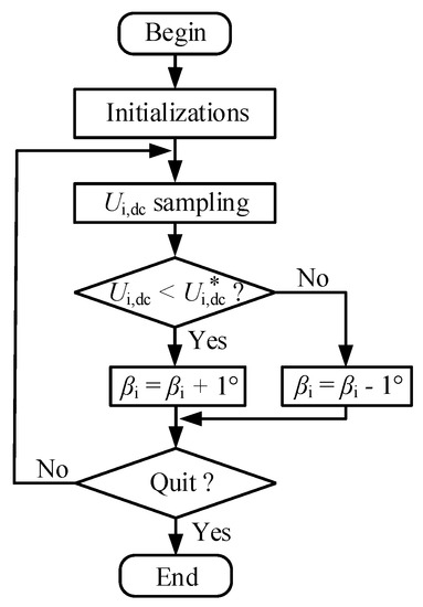 The task of reference phase calibration process is to change φi,0’ to track the point where φi = 0. After that, the receiver-side phase angles can be applied for impedance matching or output power regulation [20,21]. Many wireless charging devices require a constant voltage supply. Thus, Figure 12 shows the control flowchart for constant voltage power transfer, where Ui,dc* represents the desired voltage. If Ui,dc is greater than Ui,dc* (i.e., Ui,dc,> Ui,dc*), βi is decreased by 1°. Otherwise, βi is increased by 1°. This method is effective and easy to implement.