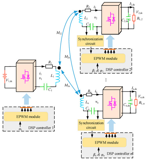 The schematic of the proposed WPT system with multiple active receivers is shown in Figure 13. A frequency locking circuit is installed on each receiver side that produces the synchronization signal for each DSP controller.