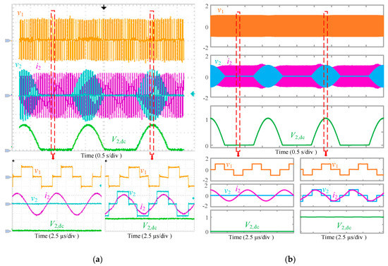 According to international standard of wireless electric vehicle charging SAE J2954 [34], the operating frequency of the WPT system ranges from 81. 38 kHz to 90 kHz. The worst possible synchronization scenario is investigated in this paper, that is, when f1 is 90 kHz. The secondary operating frequency is also set at 90 kHz. Figure 15 shows the experimental result of v1, v2, i2 and V2,dc without proposed synchronization technique. Both α1 and β2 are 45°. RL,2 is 50 Ω. The transient process is shown in the upper portion of the figure, whereas the corresponding enlarged details are shown in the lower portion. As evident from the figure, V2,dc changes periodically at a frequency about 0.6 Hz. Because of the limited frequency precision of the microcontrollers, there exists 0.6 Hz frequency difference between the transmitter and the receiver. Although the frequency difference is small compared to 90 kHz operating frequency, φ2 ranges from 0° to 360° at 0.6 Hz. Since I2,dc is a cosine function according to (8), power oscillations appear. When φ2 lies within a range of (90°, 270°), the power is transferred from the secondary side to the primary side. However, loading resistance is utilized in this experiment, which cannot provide the required power. Therefore, V2,dc becomes zero during this phase range as shown in the lower part of Figure 15a. When φ2 lies within a range of (−90°, 90°), the power is transferred to the secondary side and V2,dc is a cosine function. In simulations, the frequency of the gate drive signal is identical to the preset one, which can be used to verify the above experiment. A simulation in Simulink is implemented and f1 − f2 is set at 0.6 Hz. The simulated result in Figure 15b agrees well with the experiment, which validates the synchronization analysis. It can be concluded that WPT systems with active receivers cannot function normally without applying synchronization techniques.