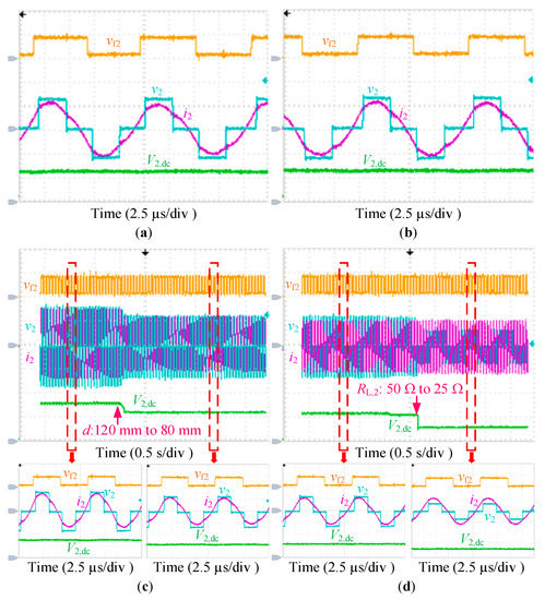 Figure 16 shows the experimental synchronization results of the proposed technique under various conditions, including vf2, v2, i2 and V2,dc. Figure 16a shows the typical experimental waveforms of the tuned WPT system. The input voltage, the phase angles and the load remain unchanged. The measured resonant frequency of the system is 91.5 kHz and the transmitter operates at this frequency. As can be seen in Figure 16a, the frequency locking signal vf2 is stable and v2 is in phase with i2. Figure 16b shows the typical waveforms of the detuned WPT system where the operating frequency is 90 kHz. The proposed synchronization technique performs well in the detuned WPT system. Figure 16c shows the experimental result during mutual inductance variation in the detuned WPT system. d12 changes from 120 mm to 80 mm, where the mutual inductance changes from 11.1 μH to 16.7 μH. V2,dc decreases with the increase of mutual inductance. As evident from the enlarged details, the system is stable and v2 is still in phase with i2. Figure 16d shows the experimental result during load variation in the detuned WPT system. RL,2 changes from 50 Ω to 25 Ω by connecting the electronic load in parallel. Although V2,dc decreases by nearly half, v2 and i2 remain in phase.