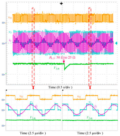 The proposed synchronization system can work effectively with variations in operating frequency, coil position and load. Then, β2 can be used to regulate the output power. Figure 17 shows the constant voltage power transfer process. The reference output voltage is set at 100 V. To guarantee the transferred power, V1,dc is increased to 80 V in this experiment. The load changes from 50 Ω to 25 Ω. To better record and observe the transition, β2 is varied by 1° each 100 millisecond in this experiment. As evident from the figures, β2 increases with decreasing RL,2 to supply more power and V2,dc stabilizes at the desired 100 V within 0.25 s. The setting period can be decreased by reducing the observation time and increasing the increment or decrement to β2. The received power increases from 200 W to 400 W and the dc-to-dc efficiency increases from 91.5% to 92.3%. For operational convenience, a magnetic core has not been used on the receiver side. The coupling factor can be increased by installing a magnetic core, which can improve the overall efficiency.