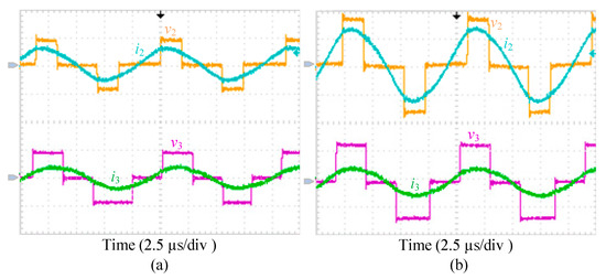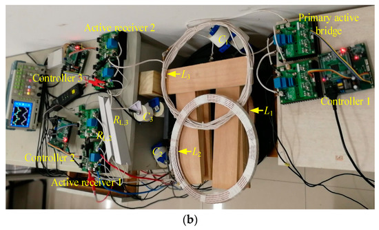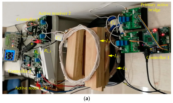 Figure 18a,b show the photographs of the multiple active receiver WPT systems without and with cross coupling between receiver-side coils, respectively. V1,dc is 50 V and α1 is set at 45°. RL,2 and RL,3 are 50 Ω. L3 is 81 μH, compensated by 0.04 μF AC capacitor. The calculated resonant frequency of receiver 2 is 88.5 kHz. The systems operates at 90 kHz, that is, the complex detuned condition. To confirm that the receivers can work under different conditions, β2 is set at 45° and β3 at 30°. In Figure 18a, the transmitting coil lies in the middle and the cross coupling between the two receiving coils is neglected. Both d12 and d13 are 80 mm. M12 and M13 are 21.2 μH and 16.7 μH, respectively. In Figure 18b, the receivers are put on the above. Except for the mutual inductances among the coils, the system parameters remain the same. M12, M13 and M23 are 8.9 μH, 11.7 μH and 4.8 μH, respectively. The cross coupling mutual inductance between the receiving coils is comparable with the mutual inductances.