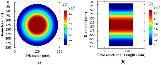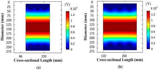 Electric potential comparison of corrugated RP GIL: (a) Pitch = 38 mm; (b) Pitch = 58 mm.