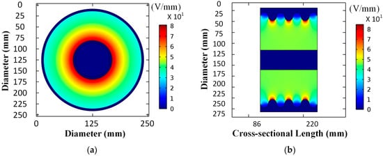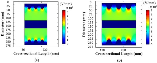 Electric field comparison of corrugated RP GIL: (a) Pitch = 38 mm; (b) Pitch = 58 mm.