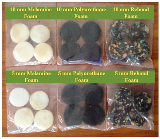 Foams are being used in industrial and commercial applications worldwide as filler, insulation, supporting material and as a dielectric material [24,25]. Polyurethane foams are already being used in low voltage and medium voltage applications and their characteristics for high voltage applications are under investigation [16,17]. Based upon their structure, foams could be categorized into two types i.e., open cell foams and closed cell foams. For pliable GIL scheme, open cell foam could be used to replace the post insulators in conventional GIL scheme. The proposed modification will enhance the structural flexibility of gas insulated lines without incorporating any complexity regarding corrugated enclosure profile. In this research, synergistic dielectric characteristics of open cell foams and insulation gases are studied through lightning impulse and disruptive discharge tests. Detailed description of different open cell foams used in the experimentation is given in Table 4 and Figure 9 shows the respective foam samples used in the test.