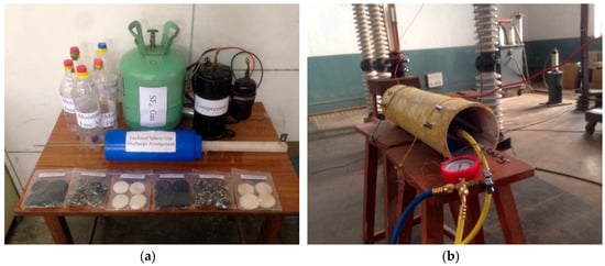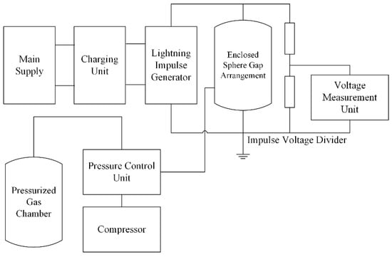 To investigate the practical feasibility of proposed insulation arrangement for pliable GIL, synergistic dielectric characteristics of various open cell foams with different insulation gases were observed in the laboratory. For the said purpose, lightning impulse and disruptive discharge tests were conducted as per IEC 60060-1:2010 standard for the foam specimens given in Table 4 alone as well as in combination with air and SF6 at different pressures [27]. Regarding disruptive discharge, ten disruptive discharges were noted for each category and then their average was considered. However, regarding the lightning impulse discharge tests, up and down method was used and then 50% impulse disruptive discharge voltage U50 for different categories was determined by using Equation (3). Figure 11 shows the block diagram for lightning impulse experiment where the enclosed sphere gap chamber is connected to the compressed gas vessel through a pressure control unit in order to control the gas pressure within the chamber. Furthermore, a compressor is also attached to the pressure control unit, in order to create vacuum in the sphere gap chamber before filling insulating gas at any desired pressure. Figure 12a shows the various components used in the experimental investigations and Figure 12b shows the test arrangement for lightning impulse and disruptive discharge tests in the high voltage laboratory.