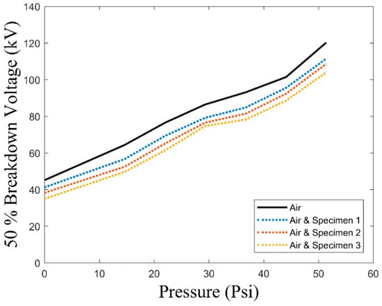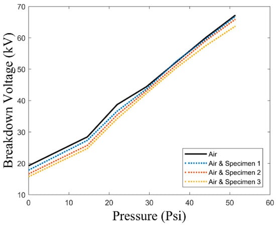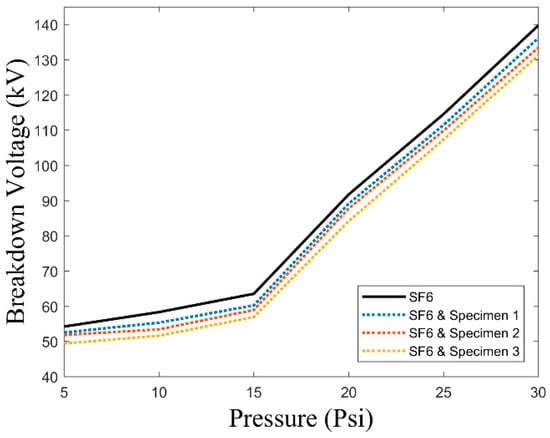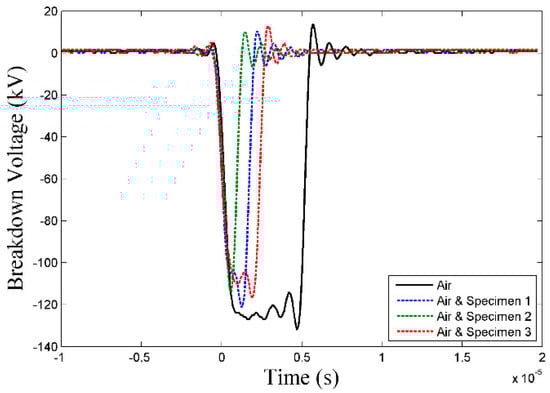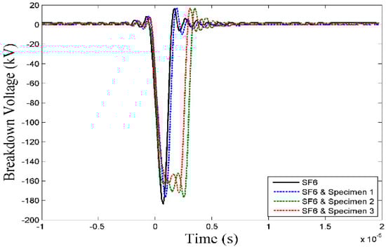 Figure 17 also shows the lightning impulse discharge test results of SF6 alone as well as in conjunction with open cell foam specimens of Table 4 at different pressures narrated above. Critical analysis of Figure 17 reveals a maximum variation of 7.1 kV for specimen 1, 8.9 kV for specimen 2 and 12.1 kV for specimen 3 in comparison to SF6 alone at respective pressures, which is quite reasonable. Figure 18 compares the recorded waveforms of lightning impulse discharge tests performed at 30 psi. Critical analysis of Figure 16, Figure 17 and Figure 18 unveil that synergistic dielectric characteristics of open cell foams and SF6 does not exhibit significant deviation from the dielectric characteristics of SF6 alone at the respective pressures. Further dielectric characteristics in both categories, i.e., SF6 alone as well as in conjunction with open cell foams vary almost in the similar pattern regarding pressure variation.