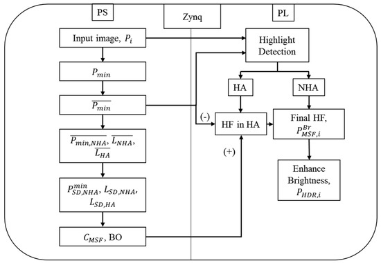 In the beginning of our development, we have separated the part that is designated for the development in the PS while we have also developed a part in the PL. For the PL side development, we use the HLS tool. The operations separated for PS and PL, respectively, are shown in Figure 6.