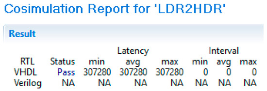 The applicability and reliability of the HLS are discussed in [33,34,35,36,37]. Tambara et al. [33] analyzed the utilization and performance of HLS-based optimization techniques, e.g., pipelining, loop unrolling, array partitioning, and function inlining. These techniques are used in three different combinations on matrix multiplication (MM), advanced encryption standard (AES), and adaptive differential pulse code modulation (ADPCM). Choi et al. [34] measured the performance of different applications, e.g., Qsort, Log reg, Mat mul, and ConvNN using HLS-based coding. Li et al. [35] focused on multi-loop optimization technique in an algorithmic way for applications such as image segmentation, denoising, edge minimization, and matrix multiplication. A data acquisition system was built based on HLS using finite impulse response (FIR) filtering by CERN researchers [36]. Daud et al. [37] used an HLS-based approach to develop an intellectual property (IP) of glucose–insulin analysis. An IP is a package of HDL coding that can be used directly in system-level register transfer logic (RTL) design. Thus far, HLS-related research has mainly focused on the performance estimation of pre-built algorithms [33,34,35]. In [36,37], the authors presented application based works, but none are related to the image processing application. The most novel aspect of our work is the development of a single image HDR algorithm by HLS-based implementation in hardware.