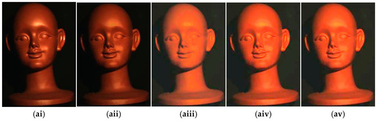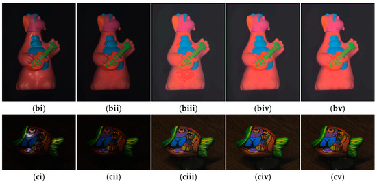 (ai–ci) Input LDR images (Idol, Doll, and Fish); (aii–cii) our HF images; (aiii–ciii) HDR images using Shen’s HF [22] images; (aiv–civ) our HDR images; and (av–cv) our HDR images by HLS C Simulation.