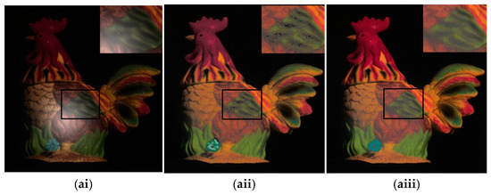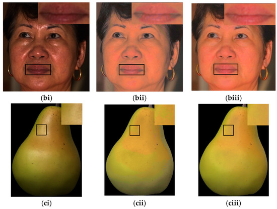 Comparison of Shen [22] and our method locally: (ai–ci) input LDR images (Hen, Face, and Green Pear); (aii–cii) HDR images using Shen’s [22] HF images; and (aiii–ciii) HDR images by our proposed method.