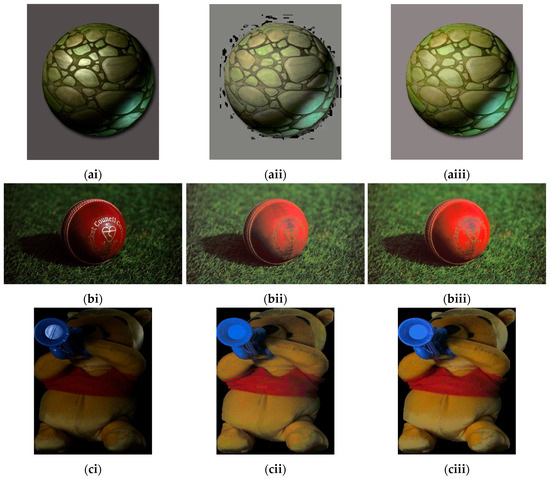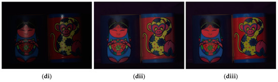 Visual comparison of Shen [22] and our method globally: (ai–di) input LDR images (Stone, Ball, Bear, and Cups); (aii–dii) HDR images using Shen’s [22] HF images; and (aiii–diii) HDR images by our proposed method.