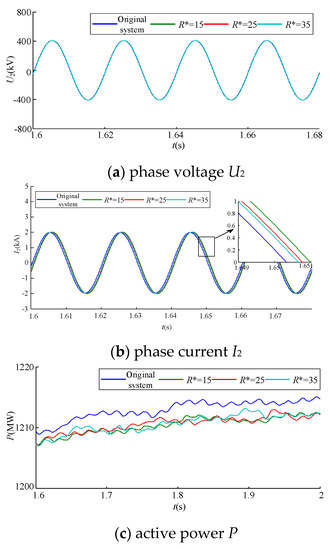 Simulation results comparison for different values of R*. (a) phase voltage U2, (b) phase current I2, (c) active power P.