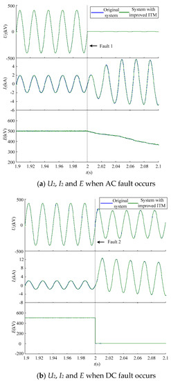 Simulation results in the transient process. (a) U2, I2 and E when AC fault occurs. (b) U2, I2 and E when DC fault occurs.