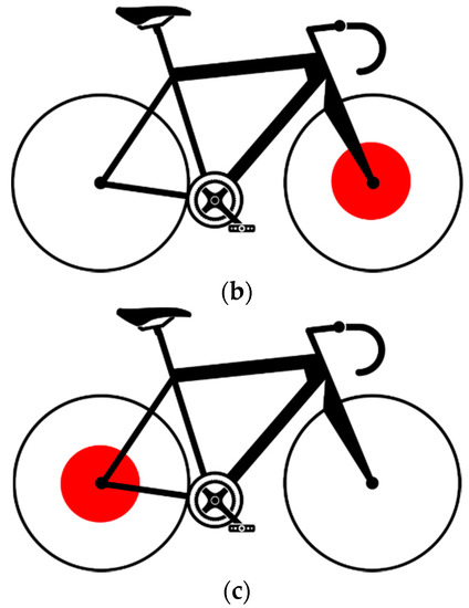 Mid-drive powertrain and hub-type powertrain. The location of assistance motors indicating where motors power is applied is shown in red. (a) Mid-drive propulsion—motor transfers power directly to the drivetrain; (b) front hub propulsion—motor is placed to spin the front tire; and (c) rear hub propulsion—motor is placed to spin the back tire.