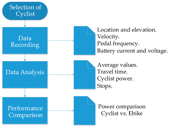 The proposed methodology consists of acquiring and analyzing quantitative data related to the riding behavior of different type of cyclists in Bogota City (Figure 2). The data are gathered trough a custom-made on-board computer (OBC) installed on each bicycle. The OBC records riding data for one week and then the information is downloaded and processed by software specifically developed for this project that returns the average values of ground velocity, pedaling frequency, cyclist power and travel time, the stops along each path, the geographical coordinates of the ride, and the voltage and current of the e-bike battery.