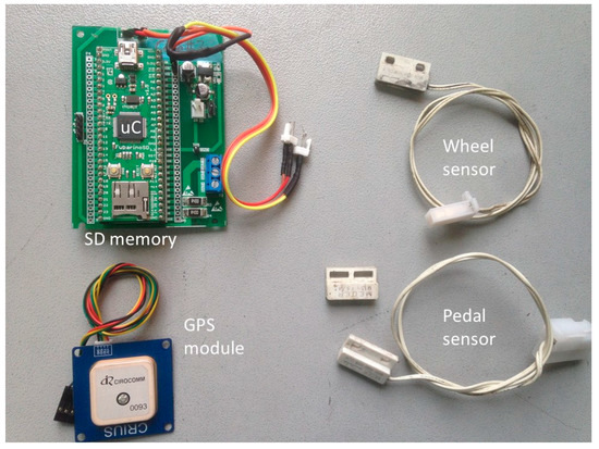 The OBC used to capture the data consists of a microprocessor unit, a microSD slot, two reed switches to measure the rotation period on wheels and pedals, a GPS module, a signal conditioning stage for e-bikes’ battery voltage and current, and a battery pack for the device power supply (Figure 3).